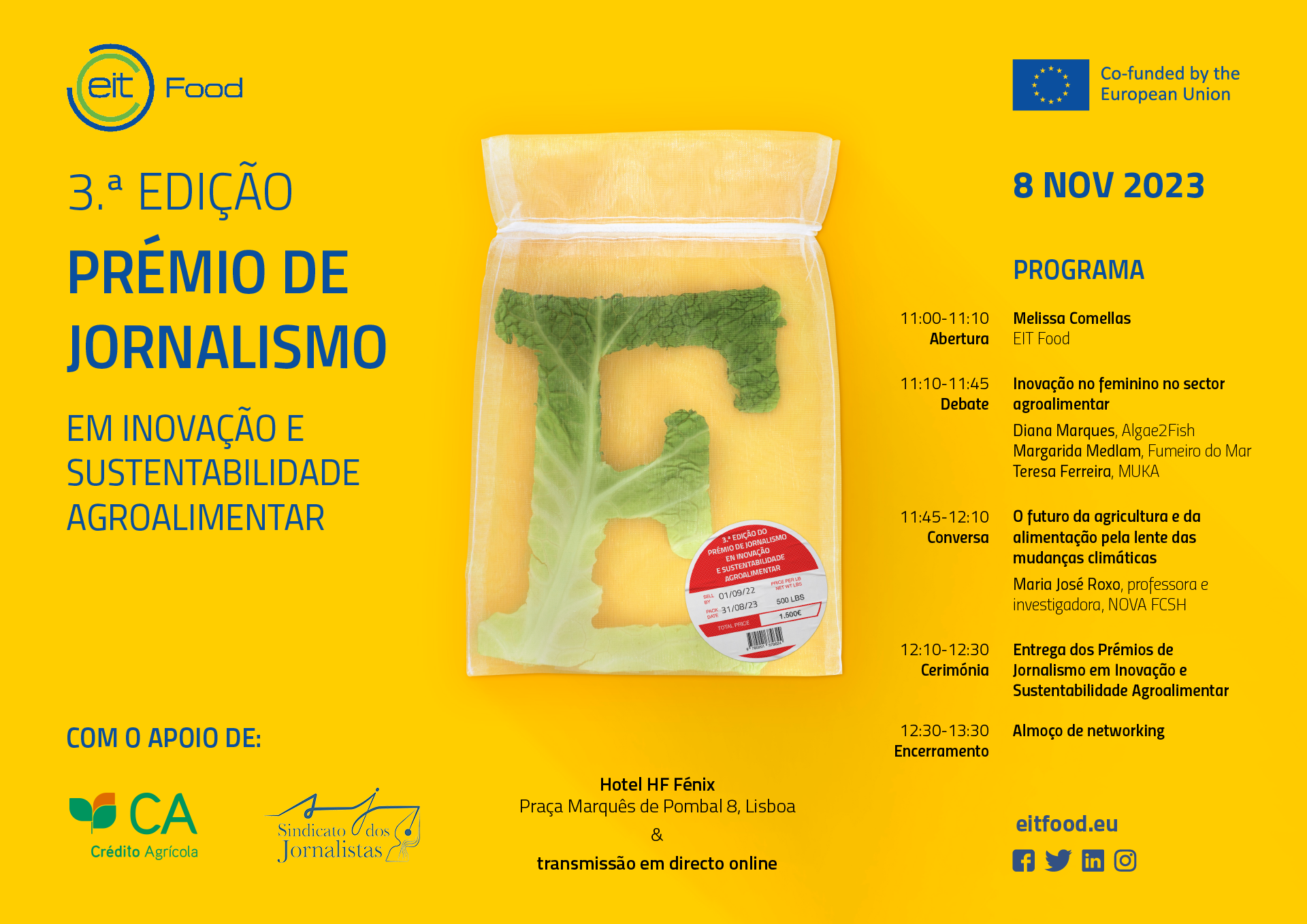 Está na hora de conhecer os vencedores da 3.ª edição do Prémio de Jornalismo EIT Food em Inovação e Sustentabilidade Agroalimentar! Após duas edições de sucesso, os prémios EIT Food estão de volta a Portugal para destacar os jornalistas que mais contribuem para promover a transformação do ecossistema agroalimentar rumo a hábitos e práticas mais saudáveis e sustentáveis. Os vencedores desta terceira edição, organizada em parceria com o Sindicato dos Jornalistas e com o apoio do Crédito Agrícola, serão revelados a 8 de novembro no Hotel HF Fénix, em Lisboa. Há três prémios à espera dos melhores trabalhos: 1500€ para o primeiro lugar, 1000€ para o segundo e 500€ para o terceiro. A cerimónia começará com um debate sobre inovação no feminino no sector agroalimentar. Vamos conhecer três exemplos de mulheres que se destacam no desenvolvimento de produtos que procuram cruzar inovação e sustentabilidade. Antes de revelarmos os vencedores teremos ainda uma conversa sobre o futuro da agricultura e da alimentação com Maria José Roxo, Professora Catedrática do Departamento de Geografia e Planeamento Regional da Faculdade de Ciências Sociais e Humanas da Universidade NOVA de Lisboa. O evento tem entrada gratuita e é aberto ao público geral (com inscrição prévia obrigatória). Além do formato presencial será ainda possível assistir online, através de live stream. Aceder à transmissão em direto. EN It's time to reveal the winners of the 3rd edition of the Portuguese EIT Food Journalism Awards in Agrifood Innovation and Sustainability! After two successful editions, the EIT Food awards are back to Portugal to highlight the journalist who contribute the most to promoting the transformation in the agrifood ecosystem, towards healthier and more sustainable habits and practices. This edition is organised in partnership with Sindicato dos Jornalistas and with the support of Crédito Agrícola. The winners will be announced on November 8, at the HF Fénix hotel, in Lisbon. Three prizes await the best works: 1500 euros for the first place, 1000 euros for the second and 500 euros for the third. The ceremony will begin with a debate about women-led innovation in the agrifood sector. We will get to know three examples of women who are standing out with the development of products that seek to combine innovation and sustainability. Before finally revealing the winners, there will be a conversation about the future of agriculture and food through the lens of climate change with Maria José Roxo, Full Professor of the Geography and Regional Planning department at NOVA University of Lisbon – School of Social Sciences and Humanities. The event is free and open to the general public (with mandatory registration). Besides attending on-site, it will also possible to follow the ceremony online, through livestream. | |